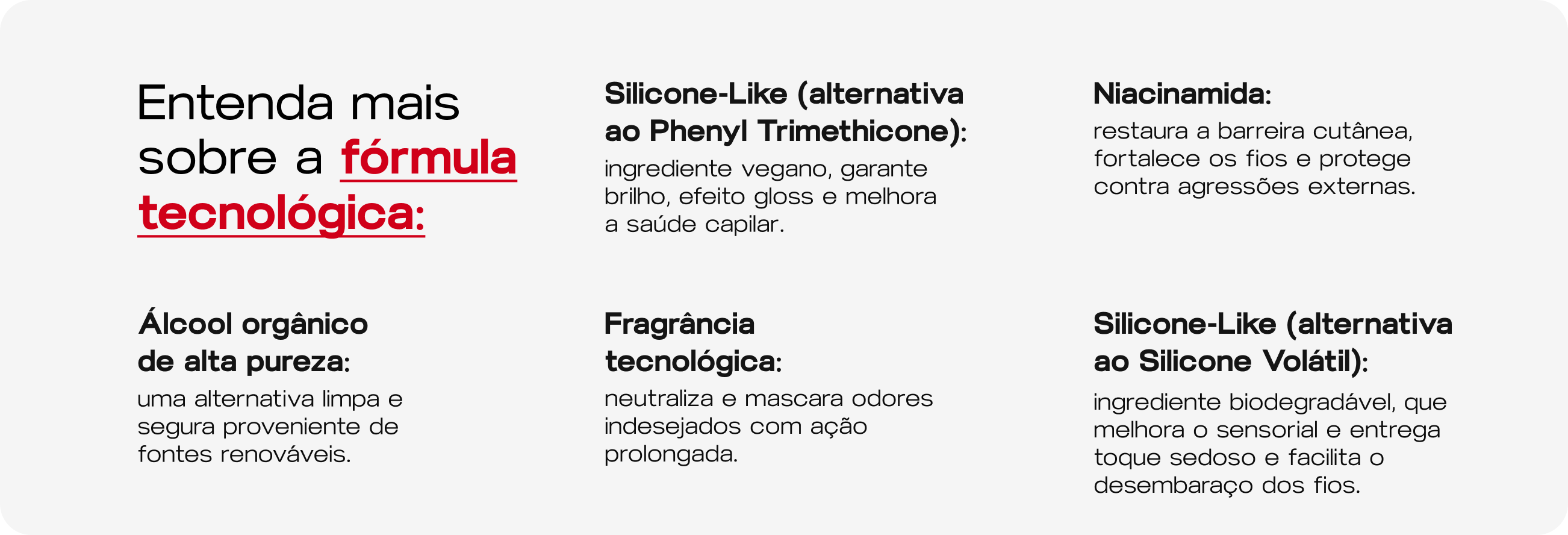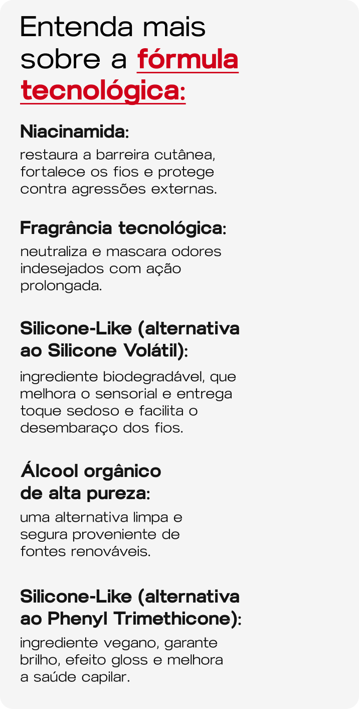 Precauções: Uso externo. Manter longe do alcance de crianças. Evitar contato com os olhos. Armazenar em local seco, arejado, ao abrigo da luz e outras fontes de calor. Não expor o cabelo a fontes de calor após a aplicação. Em caso de irritação, suspenda o uso e, caso os sinais persistam, procure um médico.
